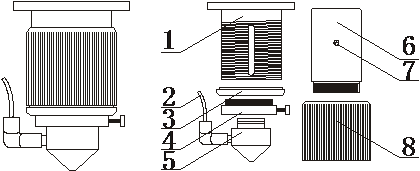 1.聚焦鏡內筒 2.進氣管 3.限位螺圈 4.氣嘴過渡套5.氣嘴 6.鏡筒 7.限位螺絲 8.調節套筒.